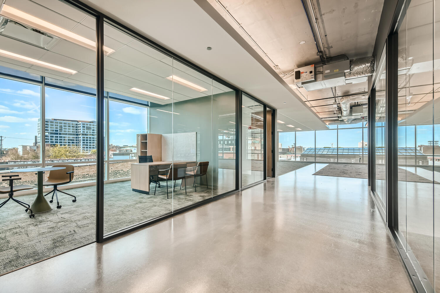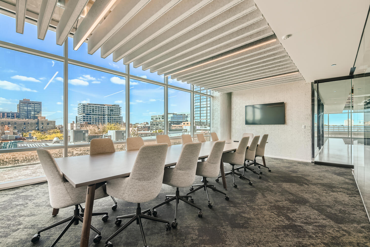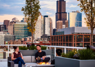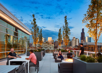 Floor-to-ceiling windows with 270-degree views of Fulton Market and the Downtown skyline